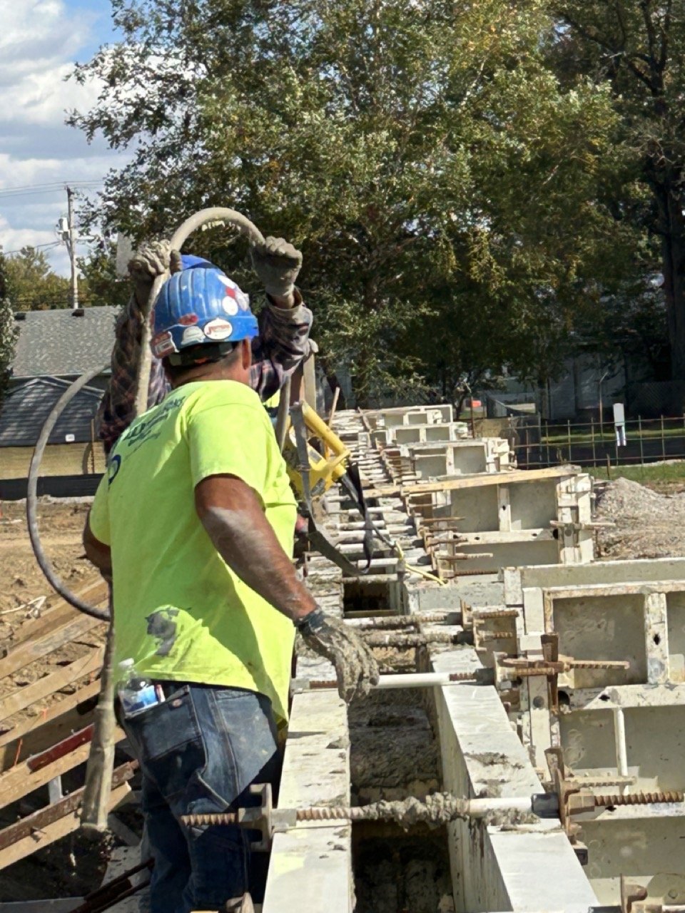 The north wall was completely formed and poured for concrete today! The entire building will eventually have a four-foot-high concrete wall around the perimeter, with openings for overhang and walk-through doors.